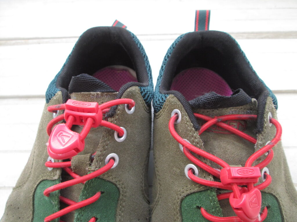 KEEN JASPER ROCKS SPの感想。どうも足を入れにくい。メーカーWEBサイトでは「脱ぎ履きが容易」となっているが、ぜんぜんそんなことは無い。思うに、履くときに「べろ」の部分が奥に入り込んでしまうのが原因ではないか。入り込まないようにべろを持とうにも、短くて硬いので持てない。仕方ないのでべろの先端に取っ手になるようなベルトを縫い付けた。履きやすくなった。