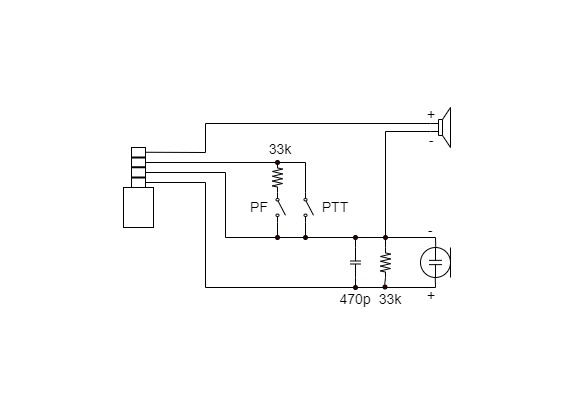 4極1ピンでPTTスイッチが1個付いているハンドマイクにPFキーを追加した。2ピンのマイクなら回路図も見つかった。スイッチと直列に抵抗を入れて区別している。しかし4極1ピンのマイクはネット検索しても情報を見つけられなかった。2ピンと同じ方式で行けないか試してみたらうまくいった。PTT-SWと直列に抵抗を入れてみた。抵抗値を変えるとPTTキーとPFキーが切り替わった。
